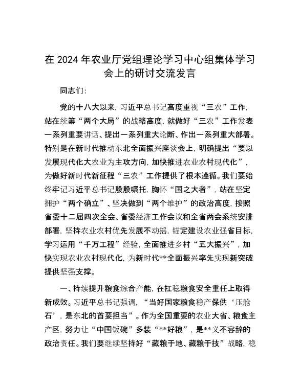 在2024年农业厅党组理论学习中心组集体学习会上的研讨交流发言 2024-07-23 Word模板 111 购买前,请一定要先点击这里看看,欢迎持续关注,精彩模板每天推送 预览结束,本文件为word文档,一共9页,共4153字,请购买后,下载后查看 购买前,请一定要先点击这里看看,欢迎持续关注,精彩模板每天推送 资源下载下载价格29 RMBVIP免费升级VIP点击检测网盘有效后购买有任何充值和下载问题请加微信:xuexixuexi66 0 演讲发言