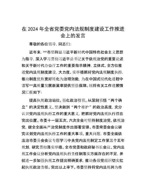 在2024年全省党委党内法规制度建设工作推进会上的发言 2024-07-23 Word模板 114 购买前,请一定要先点击这里看看,欢迎持续关注,精彩模板每天推送 预览结束,本文件为word文档,一共4页,共2035字,请购买后,下载后查看 购买前,请一定要先点击这里看看,欢迎持续关注,精彩模板每天推送 资源下载下载价格29 RMBVIP免费升级VIP点击检测网盘有效后购买有任何充值和下载问题请加微信:xuexixuexi66 0 演讲发言