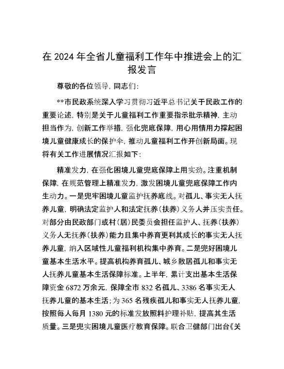 在2024年全省儿童福利工作年中推进会上的汇报发言 2024-07-23 Word模板 122 购买前,请一定要先点击这里看看,欢迎持续关注,精彩模板每天推送 预览结束,本文件为word文档,一共3页,共1431字,请购买后,下载后查看 购买前,请一定要先点击这里看看,欢迎持续关注,精彩模板每天推送 资源下载下载价格29 RMBVIP免费升级VIP点击检测网盘有效后购买有任何充值和下载问题请加微信:xuexixuexi66 0 演讲发言