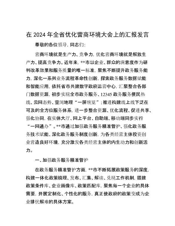 在2024年全省优化营商环境大会上的汇报发言 2024-07-23 Word模板 146 购买前,请一定要先点击这里看看,欢迎持续关注,精彩模板每天推送 预览结束,本文件为word文档,一共6页,共2717字,请购买后,下载后查看 购买前,请一定要先点击这里看看,欢迎持续关注,精彩模板每天推送 资源下载下载价格29 RMBVIP免费升级VIP点击检测网盘有效后购买有任何充值和下载问题请加微信:xuexixuexi66 0 演讲发言