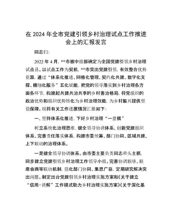 在2024年全市党建引领乡村治理试点工作推进会上的汇报发言 2024-07-23 Word模板 109 购买前,请一定要先点击这里看看,欢迎持续关注,精彩模板每天推送 预览结束,本文件为word文档,一共7页,共3024字,请购买后,下载后查看 购买前,请一定要先点击这里看看,欢迎持续关注,精彩模板每天推送 资源下载下载价格29 RMBVIP免费升级VIP点击检测网盘有效后购买有任何充值和下载问题请加微信:xuexixuexi66 0 演讲发言