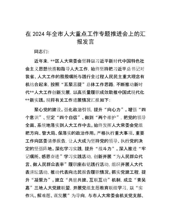 在2024年全市人大重点工作专题推进会上的汇报发言 2024-07-23 Word模板 112 购买前,请一定要先点击这里看看,欢迎持续关注,精彩模板每天推送 预览结束,本文件为word文档,一共5页,共2349字,请购买后,下载后查看 购买前,请一定要先点击这里看看,欢迎持续关注,精彩模板每天推送 资源下载下载价格29 RMBVIP免费升级VIP点击检测网盘有效后购买有任何充值和下载问题请加微信:xuexixuexi66 0 演讲发言