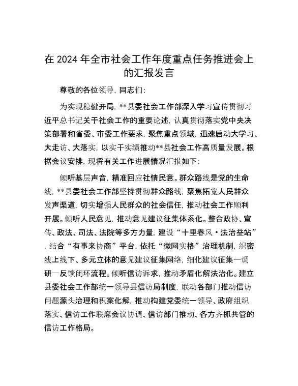 在2024年全市社会工作年度重点任务推进会上的汇报发言 2024-07-23 Word模板 111 购买前,请一定要先点击这里看看,欢迎持续关注,精彩模板每天推送 预览结束,本文件为word文档,一共3页,共1439字,请购买后,下载后查看 购买前,请一定要先点击这里看看,欢迎持续关注,精彩模板每天推送 资源下载下载价格29 RMBVIP免费升级VIP点击检测网盘有效后购买有任何充值和下载问题请加微信:xuexixuexi66 0 演讲发言