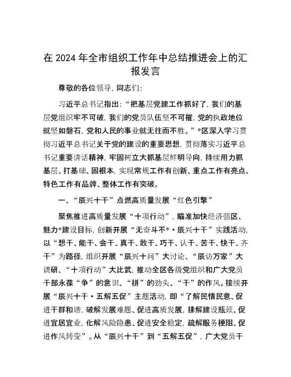 在2024年全市组织工作年中总结推进会上的汇报发言 2024-07-23 Word模板 114 购买前,请一定要先点击这里看看,欢迎持续关注,精彩模板每天推送 预览结束,本文件为word文档,一共5页,共2161字,请购买后,下载后查看 购买前,请一定要先点击这里看看,欢迎持续关注,精彩模板每天推送 资源下载下载价格29 RMBVIP免费升级VIP点击检测网盘有效后购买有任何充值和下载问题请加微信:xuexixuexi66 0 演讲发言