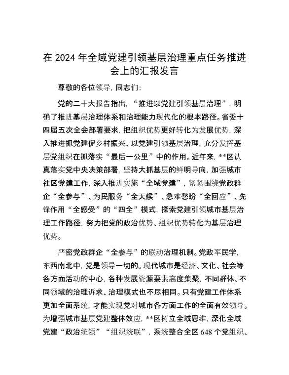 在2024年全域党建引领基层治理重点任务推进会上的汇报发言 2024-07-23 Word模板 126 购买前,请一定要先点击这里看看,欢迎持续关注,精彩模板每天推送 预览结束,本文件为word文档,一共6页,共2674字,请购买后,下载后查看 购买前,请一定要先点击这里看看,欢迎持续关注,精彩模板每天推送 资源下载下载价格29 RMBVIP免费升级VIP点击检测网盘有效后购买有任何充值和下载问题请加微信:xuexixuexi66 0 演讲发言