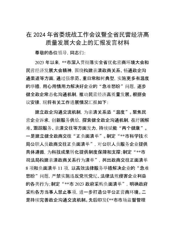 在2024年省委统战工作会议暨全省民营经济高质量发展大会上的汇报发言材料 2024-07-23 Word模板 123 购买前,请一定要先点击这里看看,欢迎持续关注,精彩模板每天推送 预览结束,本文件为word文档,一共7页,共3414字,请购买后,下载后查看 购买前,请一定要先点击这里看看,欢迎持续关注,精彩模板每天推送 资源下载下载价格29 RMBVIP免费升级VIP点击检测网盘有效后购买有任何充值和下载问题请加微信:xuexixuexi66 0 演讲发言