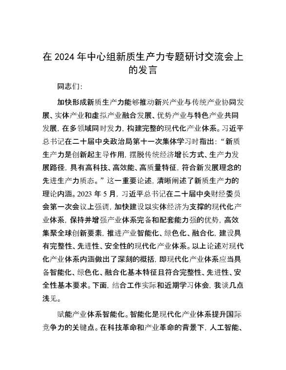 在2024年中心组新质生产力专题研讨交流会上的发言 2024-07-23 Word模板 161 购买前,请一定要先点击这里看看,欢迎持续关注,精彩模板每天推送 预览结束,本文件为word文档,一共5页,共2316字,请购买后,下载后查看 购买前,请一定要先点击这里看看,欢迎持续关注,精彩模板每天推送 资源下载下载价格29 RMBVIP免费升级VIP点击检测网盘有效后购买有任何充值和下载问题请加微信:xuexixuexi66 0 演讲发言