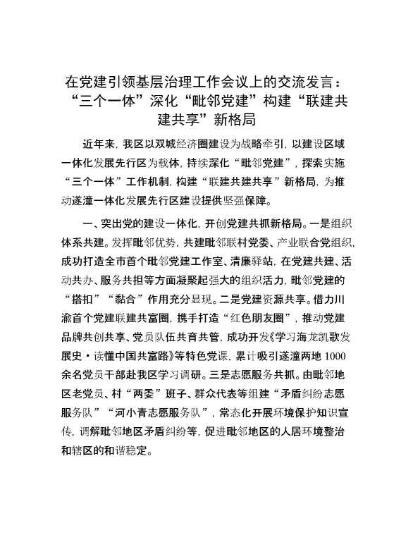 在党建引领基层治理工作会议上的交流发言:“三个一体”深化“毗邻党建” 构建“联建共建共享”新格局 2024-07-23 Word模板 141 购买前,请一定要先点击这里看看,欢迎持续关注,精彩模板每天推送 预览结束,本文件为word文档,一共3页,共1144字,请购买后,下载后查看 购买前,请一定要先点击这里看看,欢迎持续关注,精彩模板每天推送 资源下载下载价格29 RMBVIP免费升级VIP点击检测网盘有效后购买有任何充值和下载问题请加微信:xuexixuexi66 0 演讲发言