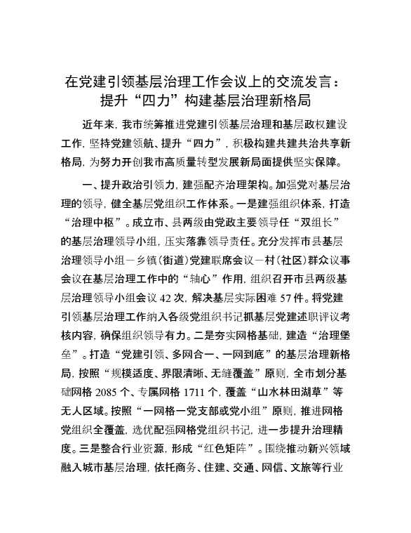 在党建引领基层治理工作会议上的交流发言:提升“四力” 构建基层治理新格局 2024-07-23 Word模板 120 购买前,请一定要先点击这里看看,欢迎持续关注,精彩模板每天推送 预览结束,本文件为word文档,一共5页,共2232字,请购买后,下载后查看 购买前,请一定要先点击这里看看,欢迎持续关注,精彩模板每天推送 资源下载下载价格29 RMBVIP免费升级VIP点击检测网盘有效后购买有任何充值和下载问题请加微信:xuexixuexi66 0 演讲发言