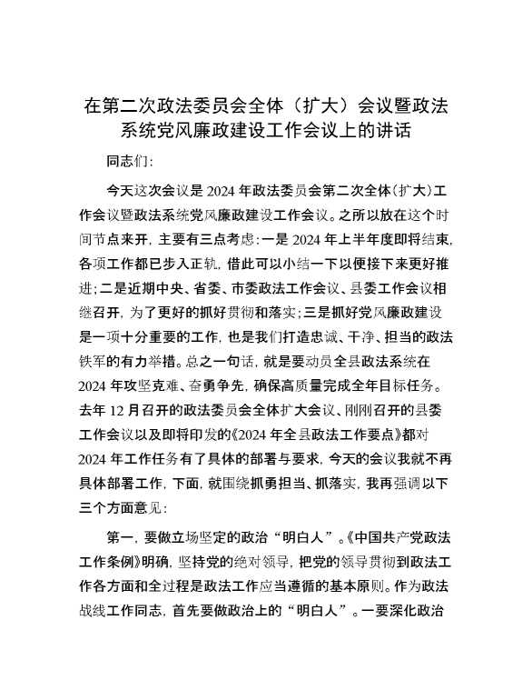 在第二次政法委员会全体(扩大)会议暨政法系统党风廉政建设工作会议上的讲话 2024-07-23 Word模板 166 购买前,请一定要先点击这里看看,欢迎持续关注,精彩模板每天推送 预览结束,本文件为word文档,一共6页,共2664字,请购买后,下载后查看 购买前,请一定要先点击这里看看,欢迎持续关注,精彩模板每天推送 资源下载下载价格29 RMBVIP免费升级VIP点击检测网盘有效后购买有任何充值和下载问题请加微信:xuexixuexi66 0 演讲发言