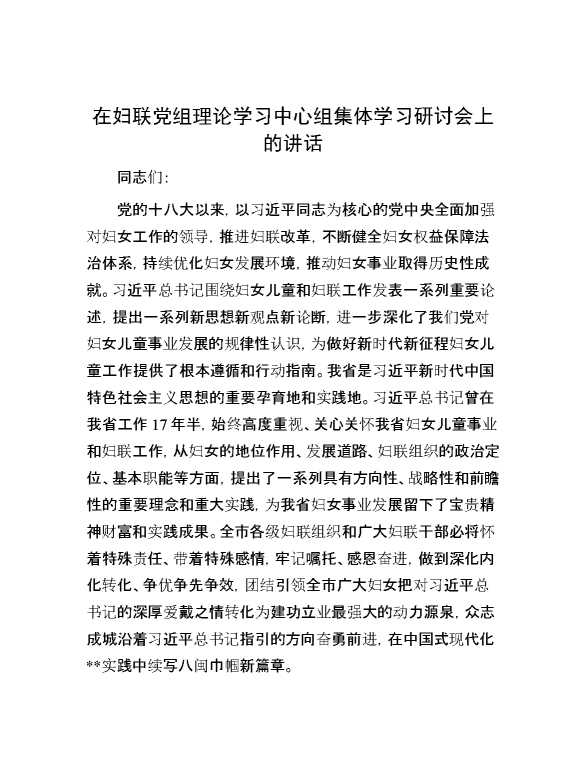 在妇联党组理论学习中心组集体学习研讨会上的讲话 2024-07-23 Word模板 122 购买前,请一定要先点击这里看看,欢迎持续关注,精彩模板每天推送 预览结束,本文件为word文档,一共6页,共3059字,请购买后,下载后查看 购买前,请一定要先点击这里看看,欢迎持续关注,精彩模板每天推送 资源下载下载价格29 RMBVIP免费升级VIP点击检测网盘有效后购买有任何充值和下载问题请加微信:xuexixuexi66 0 演讲发言