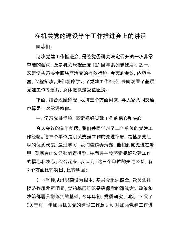 在机关党的建设半年工作推进会上的讲话 2024-07-23 Word模板 121 购买前,请一定要先点击这里看看,欢迎持续关注,精彩模板每天推送 预览结束,本文件为word文档,一共13页,共6204字,请购买后,下载后查看 购买前,请一定要先点击这里看看,欢迎持续关注,精彩模板每天推送 资源下载下载价格29 RMBVIP免费升级VIP点击检测网盘有效后购买有任何充值和下载问题请加微信:xuexixuexi66 0 演讲发言