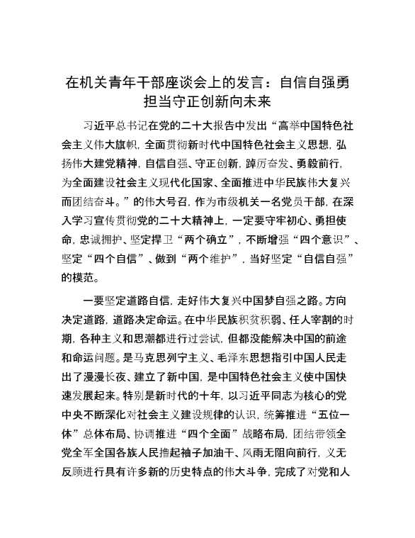 在机关青年干部座谈会上的发言:自信自强勇担当 守正创新向未来 2024-07-23 Word模板 121 购买前,请一定要先点击这里看看,欢迎持续关注,精彩模板每天推送 预览结束,本文件为word文档,一共5页,共2474字,请购买后,下载后查看 购买前,请一定要先点击这里看看,欢迎持续关注,精彩模板每天推送 资源下载下载价格29 RMBVIP免费升级VIP点击检测网盘有效后购买有任何充值和下载问题请加微信:xuexixuexi66 0 演讲发言