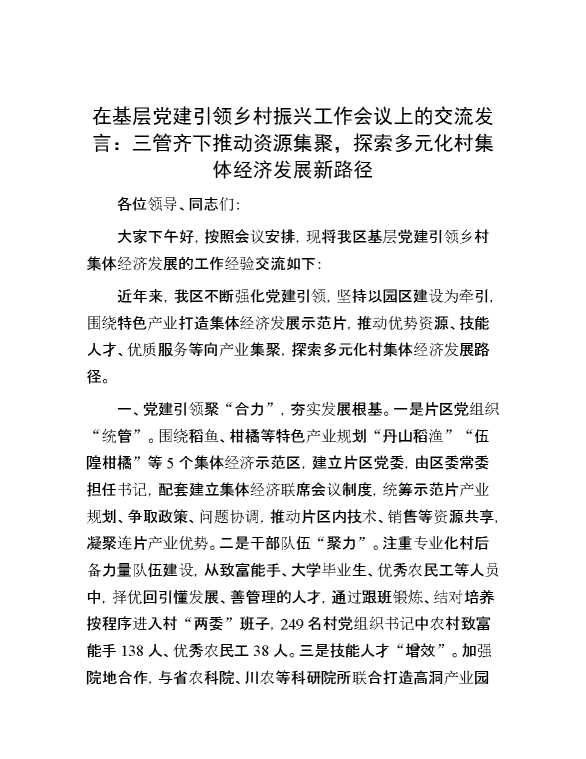 在基层党建引领乡村振兴工作会议上的交流发言:三管齐下推动资源集聚,探索多元化村集体经济发展新路径 2024-07-23 Word模板 150 购买前,请一定要先点击这里看看,欢迎持续关注,精彩模板每天推送 预览结束,本文件为word文档,一共3页,共1249字,请购买后,下载后查看 购买前,请一定要先点击这里看看,欢迎持续关注,精彩模板每天推送 资源下载下载价格29 RMBVIP免费升级VIP点击检测网盘有效后购买有任何充值和下载问题请加微信:xuexixuexi66 0 演讲发言