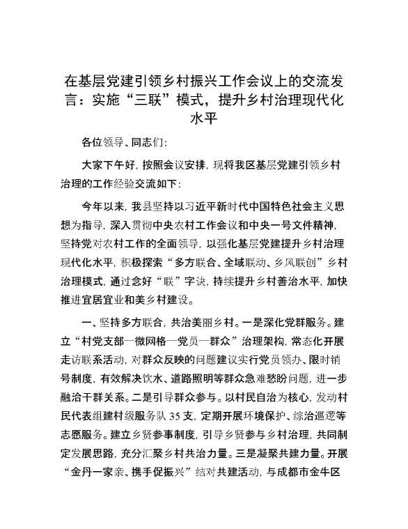 在基层党建引领乡村振兴工作会议上的交流发言:实施“三联”模式,提升乡村治理现代化水平 2024-07-23 Word模板 123 购买前,请一定要先点击这里看看,欢迎持续关注,精彩模板每天推送 预览结束,本文件为word文档,一共3页,共1007字,请购买后,下载后查看 购买前,请一定要先点击这里看看,欢迎持续关注,精彩模板每天推送 资源下载下载价格29 RMBVIP免费升级VIP点击检测网盘有效后购买有任何充值和下载问题请加微信:xuexixuexi66 0 演讲发言