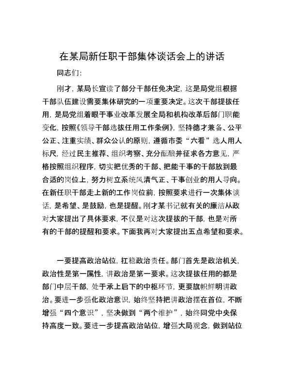 在某局新任职干部集体谈话会上的讲话 2024-07-23 Word模板 128 购买前,请一定要先点击这里看看,欢迎持续关注,精彩模板每天推送 预览结束,本文件为word文档,一共5页,共2081字,请购买后,下载后查看 购买前,请一定要先点击这里看看,欢迎持续关注,精彩模板每天推送 资源下载下载价格29 RMBVIP免费升级VIP点击检测网盘有效后购买有任何充值和下载问题请加微信:xuexixuexi66 0 演讲发言