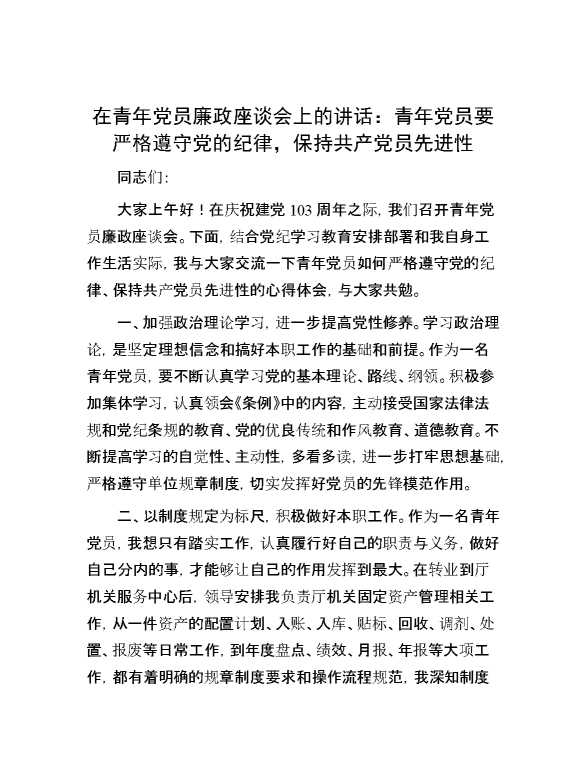 在青年党员廉政座谈会上的讲话:青年党员要严格遵守党的纪律,保持共产党员先进性 2024-07-23 Word模板 123 购买前,请一定要先点击这里看看,欢迎持续关注,精彩模板每天推送 预览结束,本文件为word文档,一共4页,共1763字,请购买后,下载后查看 购买前,请一定要先点击这里看看,欢迎持续关注,精彩模板每天推送 资源下载下载价格29 RMBVIP免费升级VIP点击检测网盘有效后购买有任何充值和下载问题请加微信:xuexixuexi66 0 演讲发言