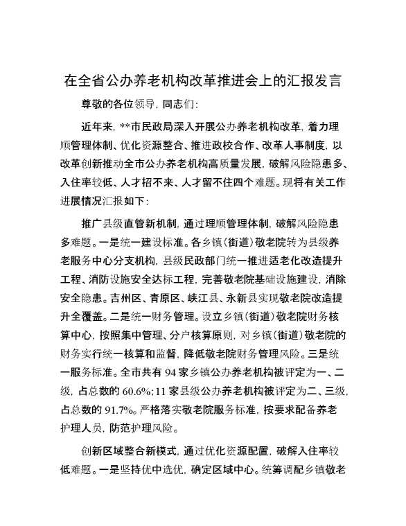 在全省公办养老机构改革推进会上的汇报发言 2024-07-23 Word模板 162 购买前,请一定要先点击这里看看,欢迎持续关注,精彩模板每天推送 预览结束,本文件为word文档,一共3页,共1467字,请购买后,下载后查看 购买前,请一定要先点击这里看看,欢迎持续关注,精彩模板每天推送 资源下载下载价格29 RMBVIP免费升级VIP点击检测网盘有效后购买有任何充值和下载问题请加微信:xuexixuexi66 0 演讲发言