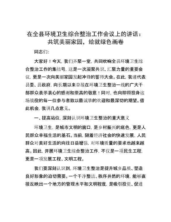 在全县环境卫生综合整治工作会议上的讲话:共筑美丽家园,绘就绿色画卷 2024-07-23 Word模板 123 购买前,请一定要先点击这里看看,欢迎持续关注,精彩模板每天推送 预览结束,本文件为word文档,一共4页,共1537字,请购买后,下载后查看 购买前,请一定要先点击这里看看,欢迎持续关注,精彩模板每天推送 资源下载下载价格29 RMBVIP免费升级VIP点击检测网盘有效后购买有任何充值和下载问题请加微信:xuexixuexi66 0 演讲发言