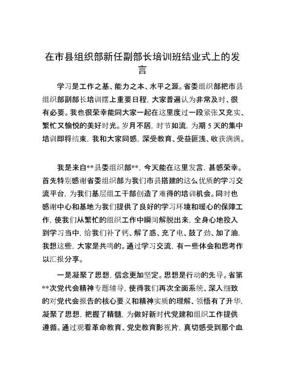 在市县组织部新任副部长培训班结业式上的发言 2024-07-23 Word模板 95 购买前,请一定要先点击这里看看,欢迎持续关注,精彩模板每天推送 预览结束,本文件为word文档,一共3页,共1362字,请购买后,下载后查看 购买前,请一定要先点击这里看看,欢迎持续关注,精彩模板每天推送 资源下载下载价格29 RMBVIP免费升级VIP点击检测网盘有效后购买有任何充值和下载问题请加微信:xuexixuexi66 0 演讲发言