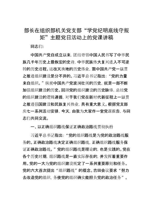 部长在组织部机关党支部“学党纪 明底线 守规矩”主题党日活动上的党课讲稿 2024-07-23 Word模板 96 购买前,请一定要先点击这里看看,欢迎持续关注,精彩模板每天推送 预览结束,本文件为word文档,一共5页,共2141字,请购买后,下载后查看 购买前,请一定要先点击这里看看,欢迎持续关注,精彩模板每天推送 资源下载下载价格29 RMBVIP免费升级VIP点击检测网盘有效后购买有任何充值和下载问题请加微信:xuexixuexi66 0 党课及生活会
