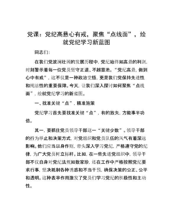 党课:党纪高悬心有戒,聚焦“点线面”,绘就党纪学习新蓝图 2024-07-23 Word模板 98 购买前,请一定要先点击这里看看,欢迎持续关注,精彩模板每天推送 预览结束,本文件为word文档,一共4页,共1412字,请购买后,下载后查看 购买前,请一定要先点击这里看看,欢迎持续关注,精彩模板每天推送 资源下载下载价格29 RMBVIP免费升级VIP点击检测网盘有效后购买有任何充值和下载问题请加微信:xuexixuexi66 0 党课及生活会