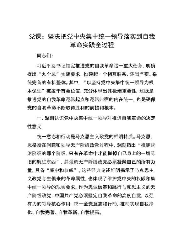 党课:坚决把党中央集中统一领导落实到自我革命实践全过程 2024-07-23 Word模板 111 购买前,请一定要先点击这里看看,欢迎持续关注,精彩模板每天推送 预览结束,本文件为word文档,一共5页,共2253字,请购买后,下载后查看 购买前,请一定要先点击这里看看,欢迎持续关注,精彩模板每天推送 资源下载下载价格29 RMBVIP免费升级VIP点击检测网盘有效后购买有任何充值和下载问题请加微信:xuexixuexi66 0 党课及生活会