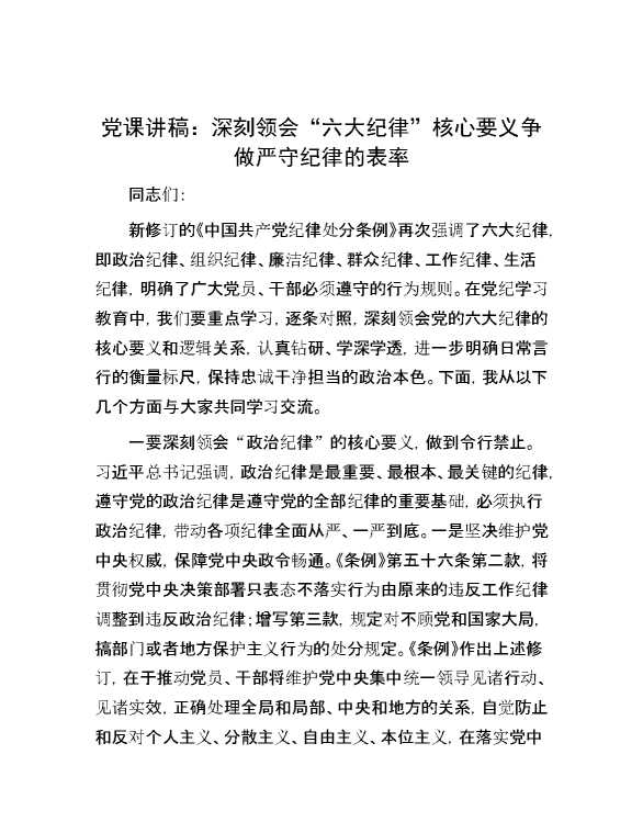 党课讲稿:深刻领会“六大纪律”核心要义 争做严守纪律的表率 2024-07-23 Word模板 106 购买前,请一定要先点击这里看看,欢迎持续关注,精彩模板每天推送 预览结束,本文件为word文档,一共13页,共6717字,请购买后,下载后查看 购买前,请一定要先点击这里看看,欢迎持续关注,精彩模板每天推送 资源下载下载价格29 RMBVIP免费升级VIP点击检测网盘有效后购买有任何充值和下载问题请加微信:xuexixuexi66 0 党课及生活会