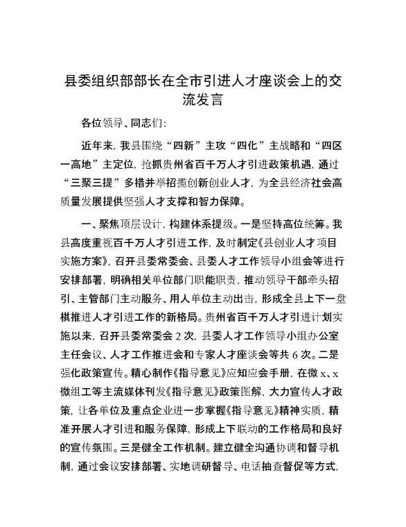 县委组织部部长在全市引进人才座谈会上的交流发言 2024-08-15 Word模板 85 购买前,请一定要先点击这里看看,欢迎持续关注,精彩模板每天推送 预览结束,本文件为word文档,一共3页,共1440字,请购买后,下载后查看 购买前,请一定要先点击这里看看,欢迎持续关注,精彩模板每天推送 资源下载下载价格59 RMBVIP免费升级VIP点击检测网盘有效后购买有任何充值和下载问题请加微信:xuexixuexi66 0 演讲发言