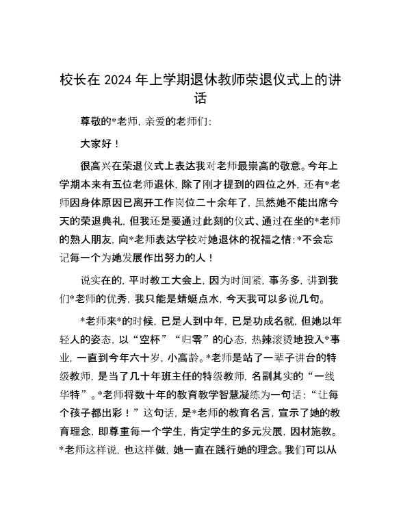 校长在2024年上学期退休教师荣退仪式上的讲话 2024-08-15 Word模板 81 购买前,请一定要先点击这里看看,欢迎持续关注,精彩模板每天推送 预览结束,本文件为word文档,一共3页,共1295字,请购买后,下载后查看 购买前,请一定要先点击这里看看,欢迎持续关注,精彩模板每天推送 资源下载下载价格59 RMBVIP免费升级VIP点击检测网盘有效后购买有任何充值和下载问题请加微信:xuexixuexi66 0 演讲发言