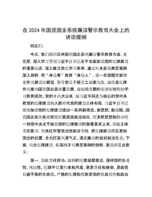 在2024年国资国企系统廉洁警示教育大会上的讲话提纲 2024-08-15 Word模板 87 购买前,请一定要先点击这里看看,欢迎持续关注,精彩模板每天推送 预览结束,本文件为word文档,一共7页,共3322字,请购买后,下载后查看 购买前,请一定要先点击这里看看,欢迎持续关注,精彩模板每天推送 资源下载下载价格59 RMBVIP免费升级VIP点击检测网盘有效后购买有任何充值和下载问题请加微信:xuexixuexi66 0 演讲发言