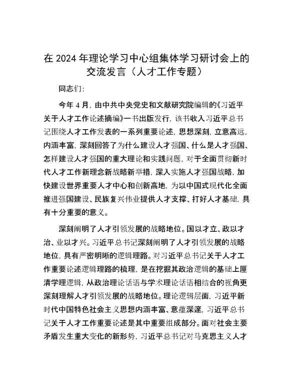在2024年理论学习中心组集体学习研讨会上的交流发言(人才工作专题) 2024-08-15 Word模板 79 购买前,请一定要先点击这里看看,欢迎持续关注,精彩模板每天推送 预览结束,本文件为word文档,一共4页,共1960字,请购买后,下载后查看 购买前,请一定要先点击这里看看,欢迎持续关注,精彩模板每天推送 资源下载下载价格59 RMBVIP免费升级VIP点击检测网盘有效后购买有任何充值和下载问题请加微信:xuexixuexi66 0 演讲发言