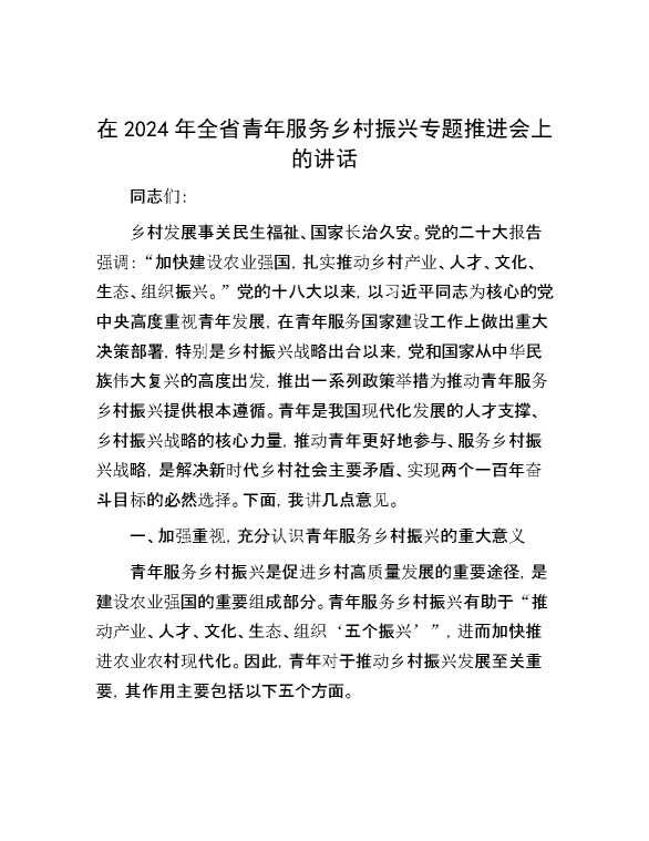 在2024年全省青年服务乡村振兴专题推进会上的讲话 2024-08-15 Word模板 83 购买前,请一定要先点击这里看看,欢迎持续关注,精彩模板每天推送 预览结束,本文件为word文档,一共13页,共6754字,请购买后,下载后查看 购买前,请一定要先点击这里看看,欢迎持续关注,精彩模板每天推送 资源下载下载价格59 RMBVIP免费升级VIP点击检测网盘有效后购买有任何充值和下载问题请加微信:xuexixuexi66 0 演讲发言