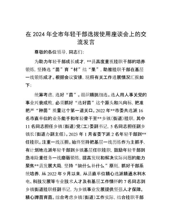 在2024年全市年轻干部选拔使用座谈会上的交流发言 2024-08-15 Word模板 80 购买前,请一定要先点击这里看看,欢迎持续关注,精彩模板每天推送 预览结束,本文件为word文档,一共3页,共1454字,请购买后,下载后查看 购买前,请一定要先点击这里看看,欢迎持续关注,精彩模板每天推送 资源下载下载价格59 RMBVIP免费升级VIP点击检测网盘有效后购买有任何充值和下载问题请加微信:xuexixuexi66 0 演讲发言