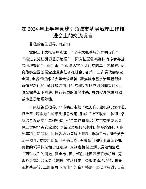 在2024年上半年党建引领城市基层治理工作推进会上的交流发言 2024-08-15 Word模板 84 购买前,请一定要先点击这里看看,欢迎持续关注,精彩模板每天推送 预览结束,本文件为word文档,一共5页,共2341字,请购买后,下载后查看 购买前,请一定要先点击这里看看,欢迎持续关注,精彩模板每天推送 资源下载下载价格59 RMBVIP免费升级VIP点击检测网盘有效后购买有任何充值和下载问题请加微信:xuexixuexi66 0 演讲发言