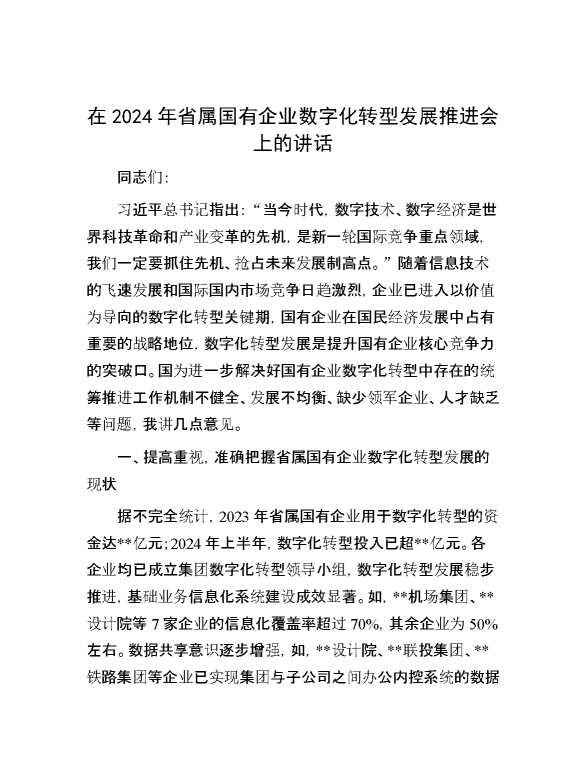 在2024年省属国有企业数字化转型发展推进会上的讲话 2024-08-15 Word模板 83 购买前,请一定要先点击这里看看,欢迎持续关注,精彩模板每天推送 预览结束,本文件为word文档,一共7页,共3302字,请购买后,下载后查看 购买前,请一定要先点击这里看看,欢迎持续关注,精彩模板每天推送 资源下载下载价格59 RMBVIP免费升级VIP点击检测网盘有效后购买有任何充值和下载问题请加微信:xuexixuexi66 0 演讲发言