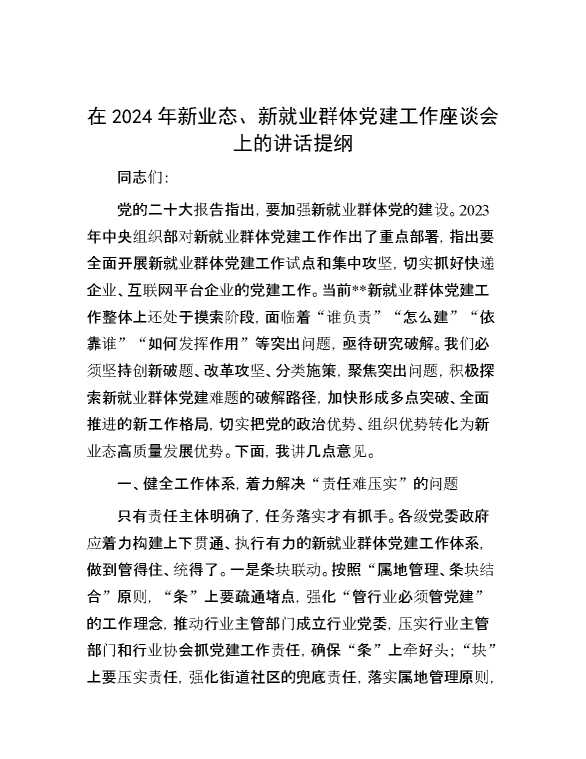在2024年新业态、新就业群体党建工作座谈会上的讲话提纲 2024-08-15 Word模板 80 购买前,请一定要先点击这里看看,欢迎持续关注,精彩模板每天推送 预览结束,本文件为word文档,一共6页,共2891字,请购买后,下载后查看 购买前,请一定要先点击这里看看,欢迎持续关注,精彩模板每天推送 资源下载下载价格59 RMBVIP免费升级VIP点击检测网盘有效后购买有任何充值和下载问题请加微信:xuexixuexi66 0 演讲发言