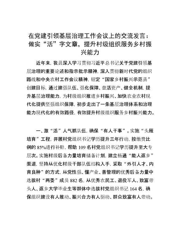 在党建引领基层治理工作会议上的交流发言:做实“活”字文章,提升村级组织服务乡村振兴能力 2024-08-15 Word模板 80 购买前,请一定要先点击这里看看,欢迎持续关注,精彩模板每天推送 预览结束,本文件为word文档,一共3页,共1295字,请购买后,下载后查看 购买前,请一定要先点击这里看看,欢迎持续关注,精彩模板每天推送 资源下载下载价格59 RMBVIP免费升级VIP点击检测网盘有效后购买有任何充值和下载问题请加微信:xuexixuexi66 0 演讲发言
