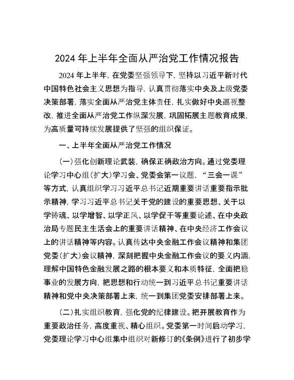 2024年上半年全面从严治党工作情况报告 2024-08-16 Word模板 92 购买前,请一定要先点击这里看看,欢迎持续关注,精彩模板每天推送 预览结束,本文件为word文档,一共5页,共2229字,请购买后,下载后查看 购买前,请一定要先点击这里看看,欢迎持续关注,精彩模板每天推送 资源下载下载价格59 RMBVIP免费升级VIP点击检测网盘有效后购买有任何充值和下载问题请加微信:xuexixuexi66 0 总结汇报