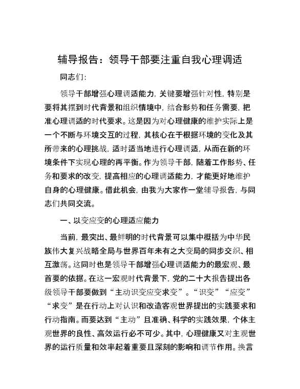 辅导报告:领导干部要注重自我心理调适 2024-08-16 Word模板 106 购买前,请一定要先点击这里看看,欢迎持续关注,精彩模板每天推送 预览结束,本文件为word文档,一共9页,共4535字,请购买后,下载后查看 购买前,请一定要先点击这里看看,欢迎持续关注,精彩模板每天推送 资源下载下载价格59 RMBVIP免费升级VIP点击检测网盘有效后购买有任何充值和下载问题请加微信:xuexixuexi66 0 总结汇报