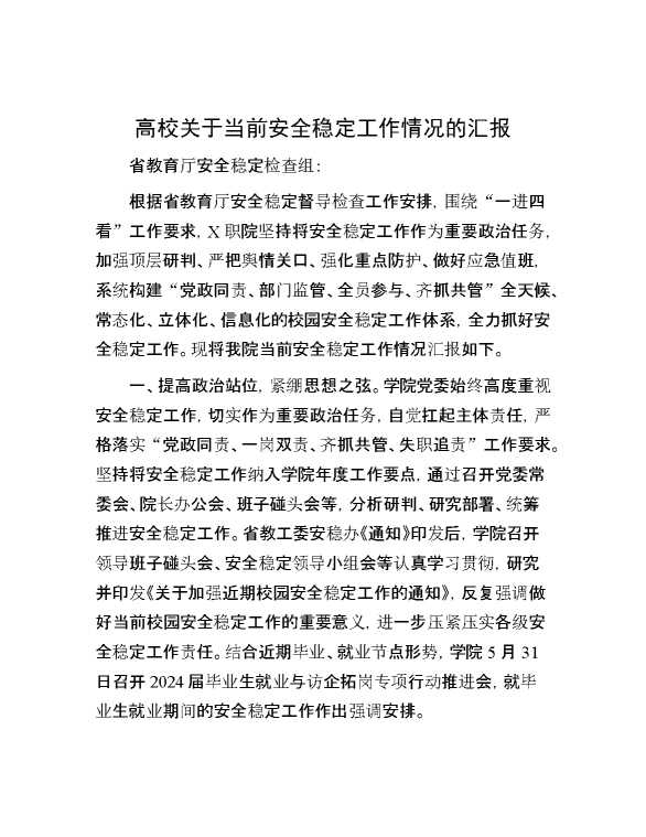 高校关于当前安全稳定工作情况的汇报 2024-08-16 Word模板 106 购买前,请一定要先点击这里看看,欢迎持续关注,精彩模板每天推送 预览结束,本文件为word文档,一共3页,共1363字,请购买后,下载后查看 购买前,请一定要先点击这里看看,欢迎持续关注,精彩模板每天推送 资源下载下载价格59 RMBVIP免费升级VIP点击检测网盘有效后购买有任何充值和下载问题请加微信:xuexixuexi66 0 总结汇报