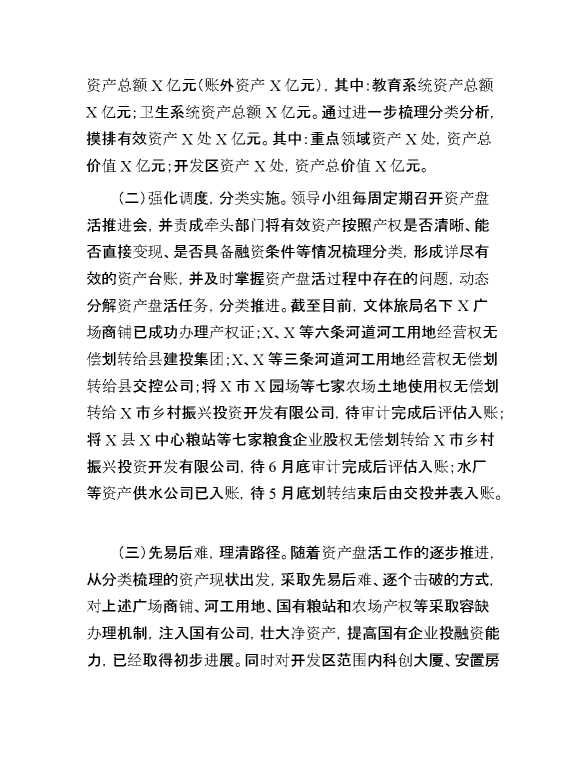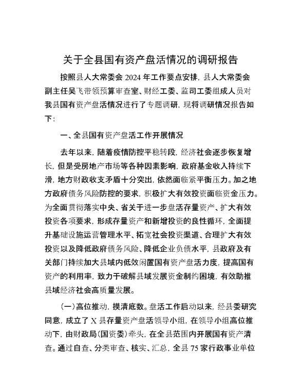 关于全县国有资产盘活情况的调研报告 2024-08-16 Word模板 107 购买前,请一定要先点击这里看看,欢迎持续关注,精彩模板每天推送 预览结束,本文件为word文档,一共6页,共2905字,请购买后,下载后查看 购买前,请一定要先点击这里看看,欢迎持续关注,精彩模板每天推送 资源下载下载价格59 RMBVIP免费升级VIP点击检测网盘有效后购买有任何充值和下载问题请加微信:xuexixuexi66 0 总结汇报