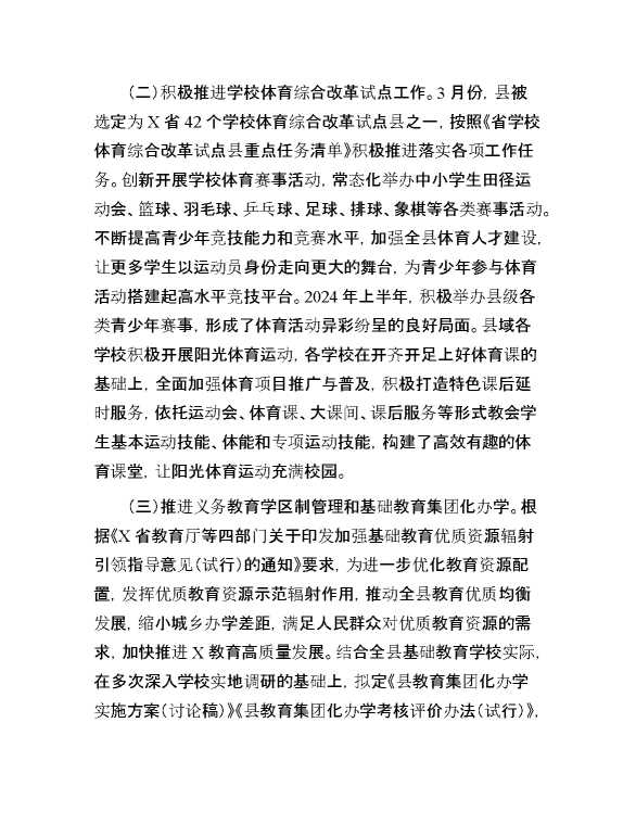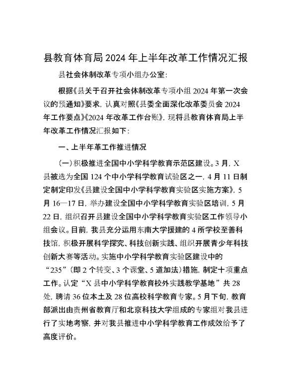 县教育体育局2024年上半年改革工作情况汇报 2024-08-16 Word模板 103 购买前,请一定要先点击这里看看,欢迎持续关注,精彩模板每天推送 预览结束,本文件为word文档,一共5页,共2334字,请购买后,下载后查看 购买前,请一定要先点击这里看看,欢迎持续关注,精彩模板每天推送 资源下载下载价格59 RMBVIP免费升级VIP点击检测网盘有效后购买有任何充值和下载问题请加微信:xuexixuexi66 0 总结汇报
