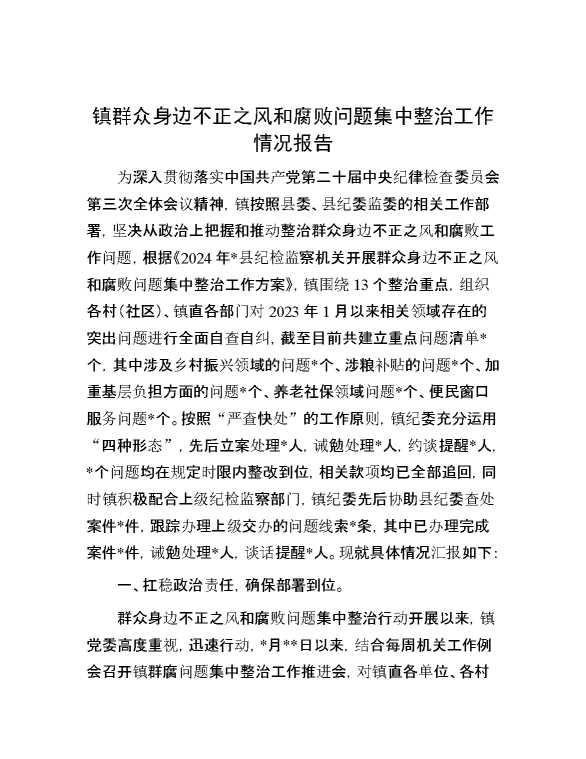 镇群众身边不正之风和腐败问题集中整治工作情况报告 2024-08-16 Word模板 130 购买前,请一定要先点击这里看看,欢迎持续关注,精彩模板每天推送 预览结束,本文件为word文档,一共4页,共1520字,请购买后,下载后查看 购买前,请一定要先点击这里看看,欢迎持续关注,精彩模板每天推送 资源下载下载价格59 RMBVIP免费升级VIP点击检测网盘有效后购买有任何充值和下载问题请加微信:xuexixuexi66 0 总结汇报