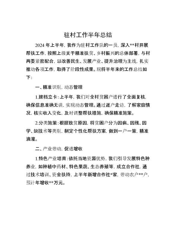 驻村工作半年总结 2024-08-16 Word模板 144 购买前,请一定要先点击这里看看,欢迎持续关注,精彩模板每天推送 预览结束,本文件为word文档,一共3页,共900字,请购买后,下载后查看 购买前,请一定要先点击这里看看,欢迎持续关注,精彩模板每天推送 资源下载下载价格59 RMBVIP免费升级VIP点击检测网盘有效后购买有任何充值和下载问题请加微信:xuexixuexi66 0 总结汇报