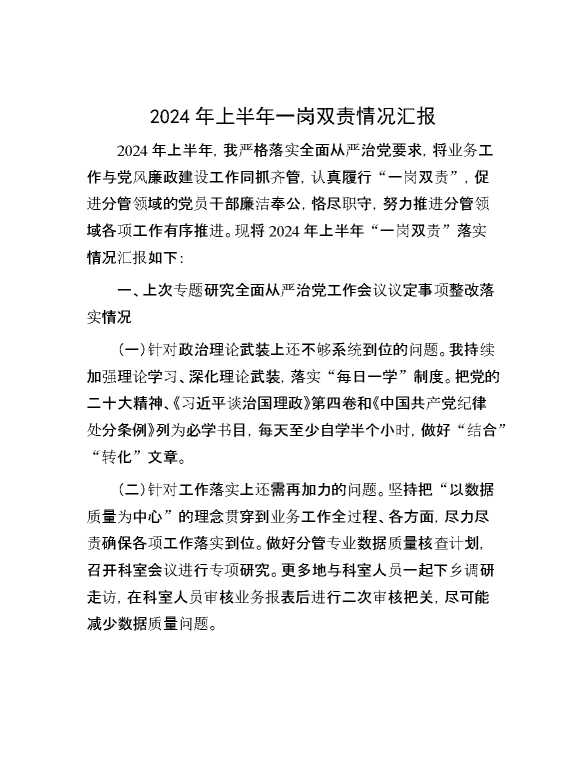 2024年上半年一岗双责情况汇报 2024-08-19 Word模板 81 购买前,请一定要先点击这里看看,欢迎持续关注,精彩模板每天推送 预览结束,本文件为word文档,一共6页,共2673字,请购买后,下载后查看 购买前,请一定要先点击这里看看,欢迎持续关注,精彩模板每天推送 资源下载下载价格59 RMBVIP免费升级VIP点击检测网盘有效后购买有任何充值和下载问题请加微信:xuexixuexi66 0 总结汇报