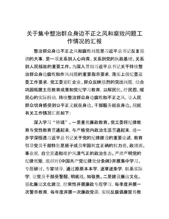 关于集中整治群众身边不正之风和腐败问题工作情况的汇报 2024-08-19 Word模板 114 购买前,请一定要先点击这里看看,欢迎持续关注,精彩模板每天推送 预览结束,本文件为word文档,一共3页,共1385字,请购买后,下载后查看 购买前,请一定要先点击这里看看,欢迎持续关注,精彩模板每天推送 资源下载下载价格59 RMBVIP免费升级VIP点击检测网盘有效后购买有任何充值和下载问题请加微信:xuexixuexi66 0 总结汇报