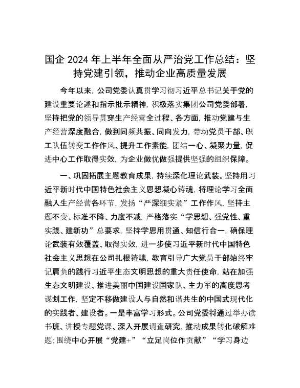 国企2024年上半年全面从严治党工作总结:坚持党建引领,推动企业高质量发展 2024-08-19 Word模板 161 购买前,请一定要先点击这里看看,欢迎持续关注,精彩模板每天推送 预览结束,本文件为word文档,一共6页,共3062字,请购买后,下载后查看 购买前,请一定要先点击这里看看,欢迎持续关注,精彩模板每天推送 资源下载下载价格59 RMBVIP免费升级VIP点击检测网盘有效后购买有任何充值和下载问题请加微信:xuexixuexi66 0 总结汇报