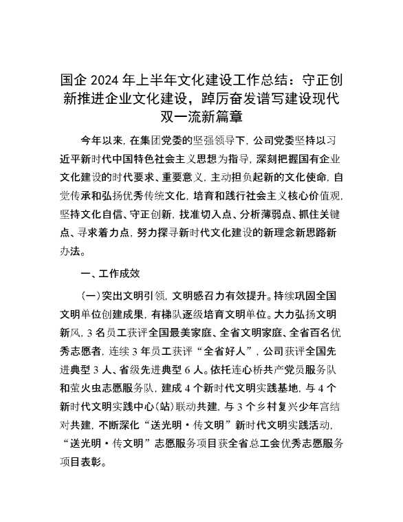 国企2024年上半年文化建设工作总结:守正创新推进企业文化建设,踔厉奋发谱写建设现代双一流新篇章 2024-08-19 Word模板 116 购买前,请一定要先点击这里看看,欢迎持续关注,精彩模板每天推送 预览结束,本文件为word文档,一共6页,共2647字,请购买后,下载后查看 购买前,请一定要先点击这里看看,欢迎持续关注,精彩模板每天推送 资源下载下载价格59 RMBVIP免费升级VIP点击检测网盘有效后购买有任何充值和下载问题请加微信:xuexixuexi66 0 总结汇报