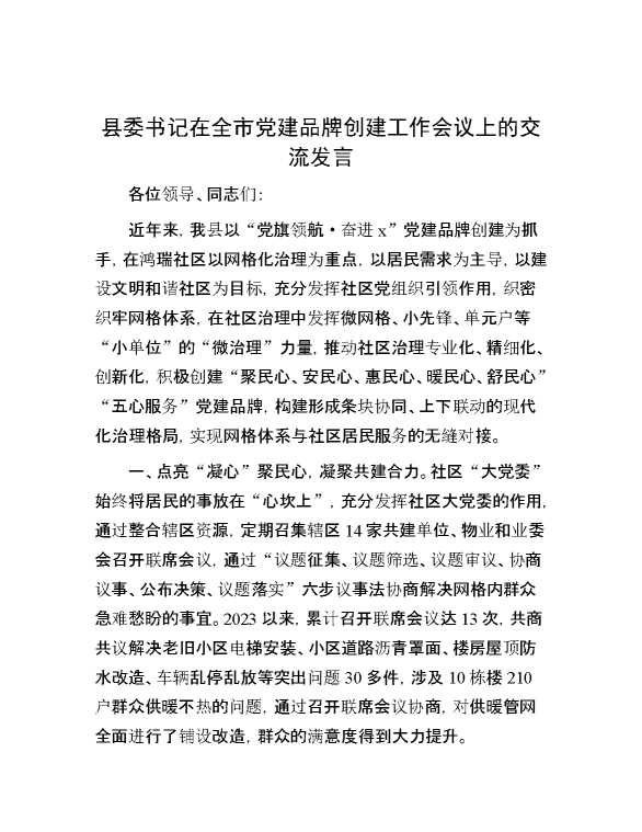 县委书记在全市党建品牌创建工作会议上的交流发言 2024-08-21 Word模板 101 购买前,请一定要先点击这里看看,欢迎持续关注,精彩模板每天推送 预览结束,本文件为word文档,一共4页,共1461字,请购买后,下载后查看 购买前,请一定要先点击这里看看,欢迎持续关注,精彩模板每天推送 资源下载下载价格59 RMBVIP免费升级VIP点击检测网盘有效后购买有任何充值和下载问题请加微信:xuexixuexi66 0 演讲发言